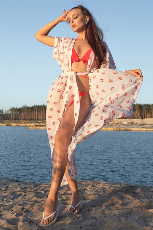 Новая летняя коллекция Party on the beach от интернет-магазина Seventeen предлагает сделать свой пляжный образ нарядным и неподражаемым вместе с молодежной туникой белого цвета. Полупрозрачный шифон обеспечивает легкость и романтичность, а красные губки нотку пикантности. Длинная туника имеет свободный фасон с короткими цельнокроеными рукавами. В комплекте с гламурной пляжной моделью идет съемный пояс.