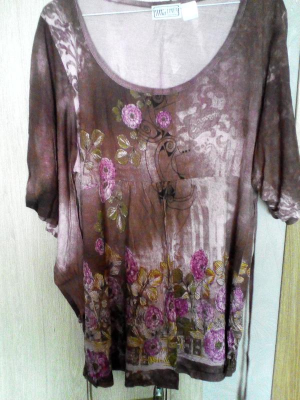 Туника с цветочным узором и оригинальными рукавами.Длина по спинке 76 см.Длина рукава 37 см.Длину меряла от плеча,внизу рукав длиннее и идет острым углом.Расстояние от проймы до проймы.-56 см.ПоТ 49 см.Туника по талии отрезная,с пояском. Очень красивая расцветка и цветочный принт.Материал очень приятный к телу,лёгкий.Производство Индия.
