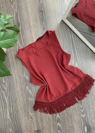 Майка-блуза з китицями цегляного кольору ПОГ - 48 см низ - 48 см довжина - 56 см Розмір М Стан ідеальний Відправка на наступний день після оплати або передоплати у розмірі доставки в дві сторони.