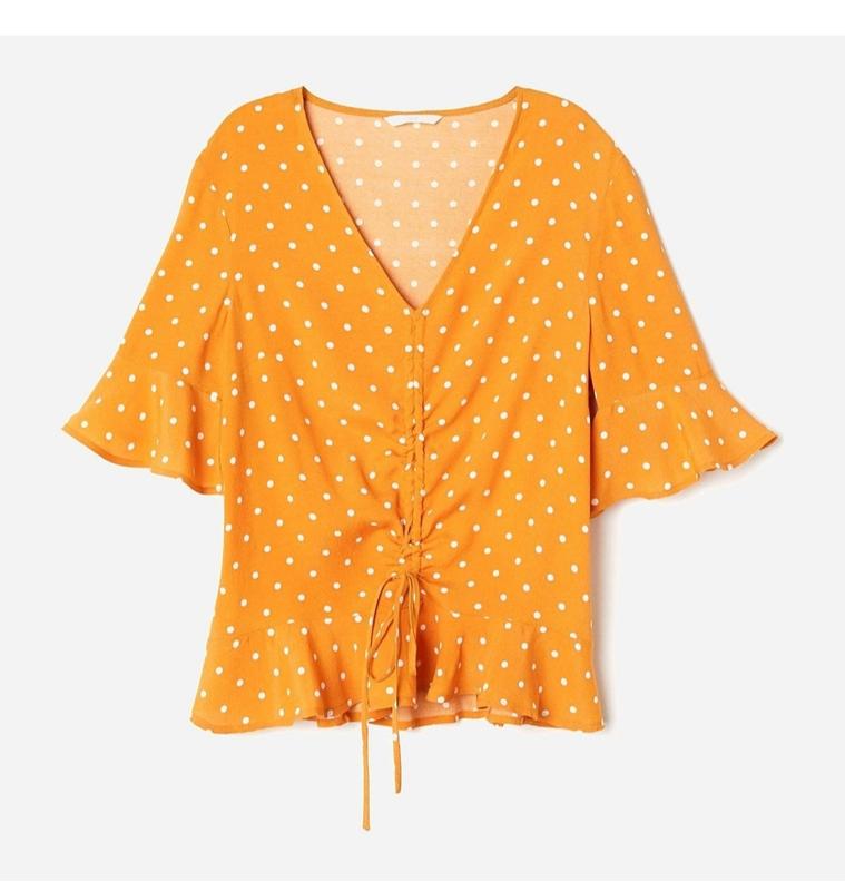 32 р Топ с коротким рукавом из креповой ткани с треугольным вырезом на кулиске, короткими отрезными рукавами с оборкой и асимметричным швом с воланом по низу.