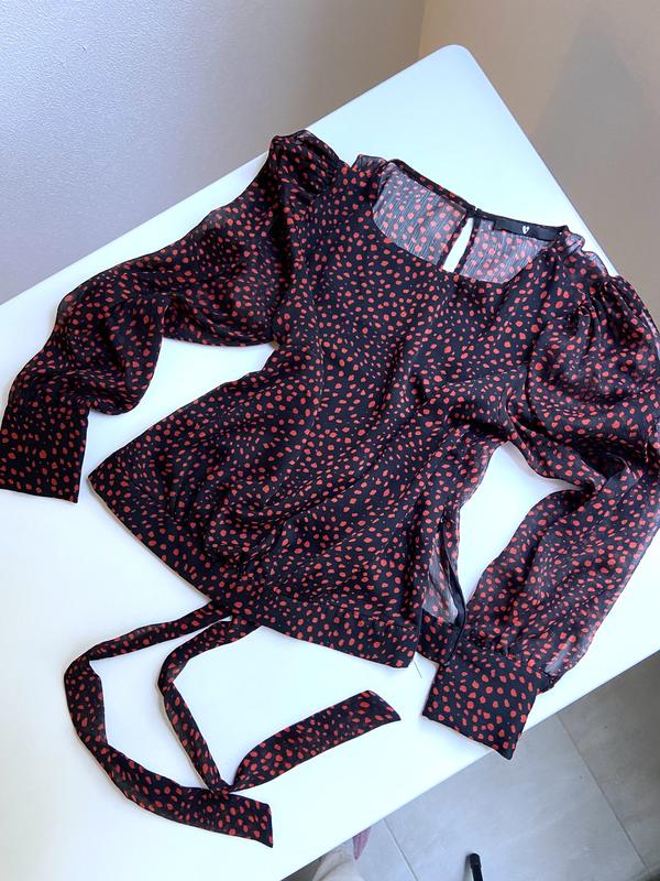 Очень красивая блузка в горошек, спинка полупрозрачная, с вырезом и бантом. Спереди ничего не просвечивается, есть подкладка. Стан идеальный, одевала пару раз