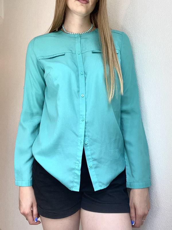 Блуза бирюзового цвета, легкая, яркая, со скрытыми пуговицами
