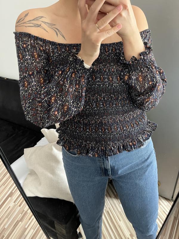 Дуужый красивый топ на длинный рукав Можно носить как со спущенными рукавами, так и посадка на месте Резинка присборенная, приятный к телу Дополнительные фото/видео и замеры напишу в сообщение