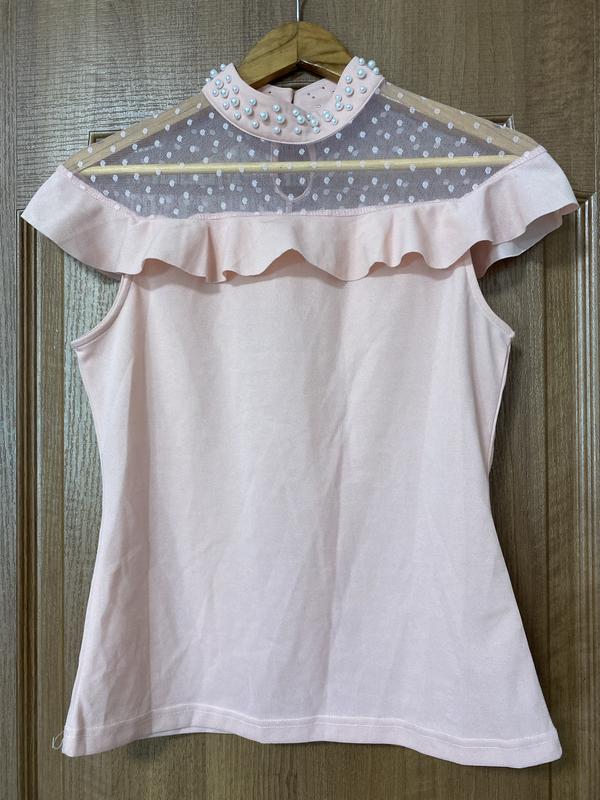 Нежно розового коляса Размер L На шее украшена бисерами Недостаток: миниатюрное пятнышко которое находится на фото Плечи 44 Груди 47 Длина 57