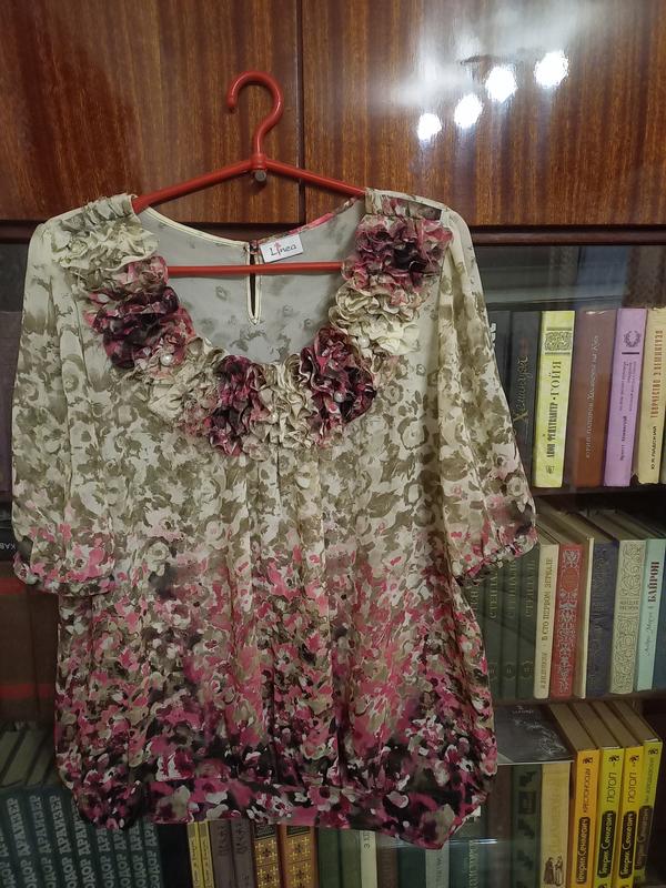 Очень оригинальная шифоновая блуза, шифон не светится. Спереди по горловине красивое украшение из ткани и жемчужными бусинами. Сзади застежка на пуговицу. По рукаву маленький манжет. По низу тоже манжет с резинкой. Очень красивая блуза, красиво смотрится. ПОГ 62 см, полухват внизу по манжету в нерастянутом 55 см, в растянутом виде 63 см. Рукав 38 см, длина 69 см. Купите, не пожалеете. Торг уместен.