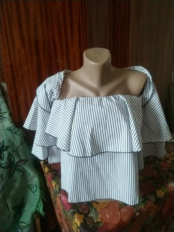 очень красивая блуза в полоску с рукавами рюшами.Над грудью есть силиконовая полоска,хорошо держится на теле.На бирке состав и размер не указано,подойдёт на м,л.На рукаве ,для рука маленькое расстояние,наверное надо распустить(последнее фото). описание состояние отличное длина;47 ширина груди 45