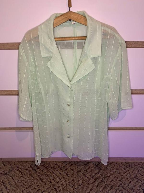 Размер 52-54 Ог-58 От-56 Длина по спине-71 По бокам есть разрезы Цвет нежно салатовый Просвечивается ткань, очень легкая, элегантная, на лето то что надо 70 грн