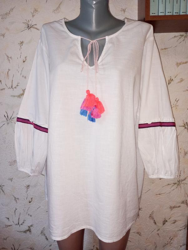 Размер на этикетке на фото 2, смотрите внимательно замеры. Состояние очень хорошее. !!!! Есть незначительный нюанс - три маленьких пятна у горловины, едва заметны, видно на последнем фото. Ткань тонкая, не тянется, не просвечивает. На ощупь как хлопок, не синтетика. Этикетка со складом ткани отсутствует. Цвет - белый. длина от верхней точки плеча до низа 72. длина рукава от плечевого шва 48, от горловины 61. полуобхват бицепса 23. полуобхват груди 74. полу охват талии 75. полуобхват бедер 79. ширина между плечевыми швами 48. 66