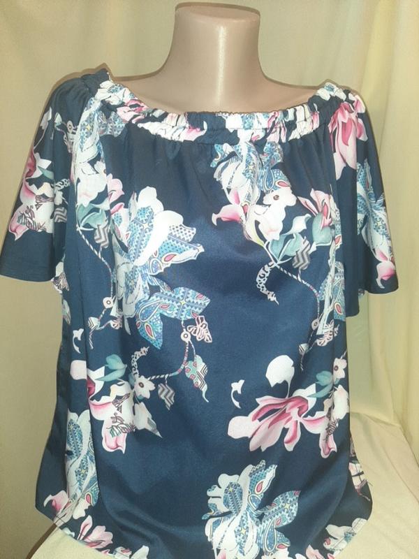 Блузка в цветах ХL, можно опускать с плеч, потому что идет на резинке. ПОГ - 53, ПОТ - 58, длина - 55/66, рукав - 27см