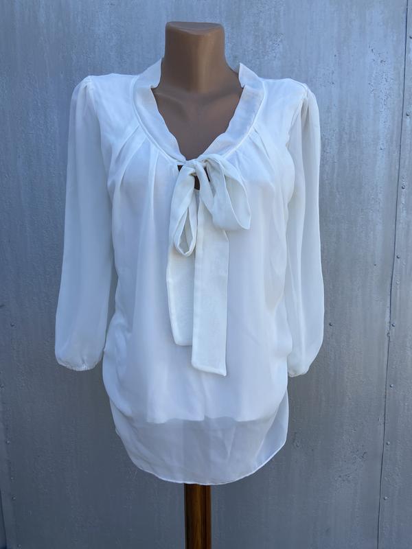 Белая блуза Стан - идеальный. Ориентировочно подойдет на размер М, но лучше смотрите на замеры. Блуза тянется. Замеры: От плеча до плеча - 39 см Полуобхват груди (ширина под подмышками) – 47 см Полуобхват талии (в самой узкой части талии) – 43 см Длина рукава от плеча - 46 см Длина - 69 см