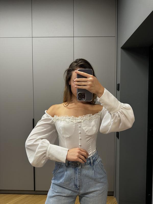 Белая блуза, размер хс, с. Лучше брать на более большую грудь но и с дисплей сидит круто😅