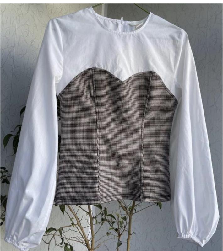 Оригинальная блуза H&М 🤍🤎 с эмитацией корсета в гусиную лапку, пышный рукав, сзади на молнии. Размер S. Замеры: ПО плече 36, ПО груди 42, рукав 62, длина 55. ⚘смотрите и другие Мои объявления и подписывайтесь.