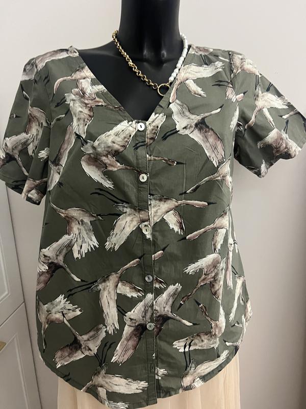 Просто невероятный принт с птицами 🖤 🤎 Рубашка подойдет на размер L, Бирка отсутствует но это хлопок 🌿 Длина 60см Пог 53см В идеальном состоянии.