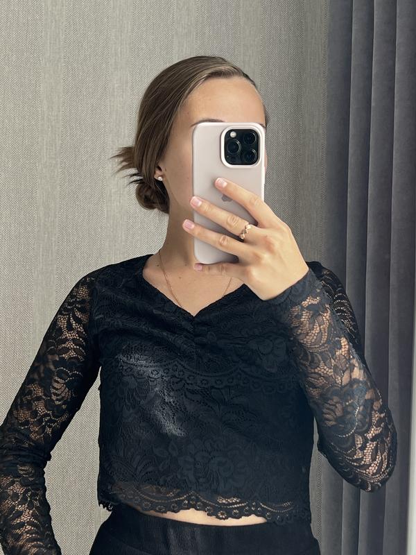 Укороченная блуза с ажурным рукавом. Стан - идеальный. Размер XS. Полиамид 90%, эластан 19%.