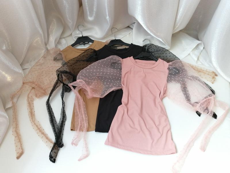 футболка блузка в рубчик пишний об'ємний рукав ліхтарик прозора органза в горох з красивими бантами зав'язки розмір єдиний універсальний плечі від шва до шва 29 см напівобхват грудей 36 см тягнеться на 62 см напівобхват талії 38 см тягнеться на 64 см довжина футболки 53 см довжина рукава від плечового шва 33 см допускаю похибку вимір плюс-мінус 1 см