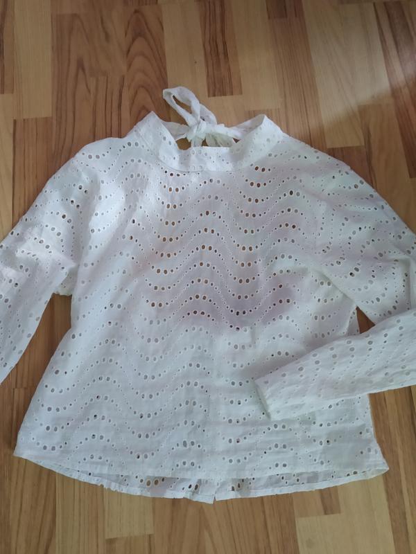 Стильная белая блузка, перед закрытый, с уди спинка открытая, связывается на бантик и защелкивается на пуговицы. Тканина вибита