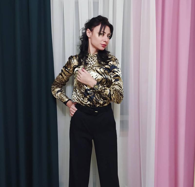 Блузка зi штучного шовку, комiр- стiйка, застiбка закрита планка на ґудзиках, рукав довгий з манжетом. Має декоративнi ґудзики з камiнчиками. В одному экземплярi.