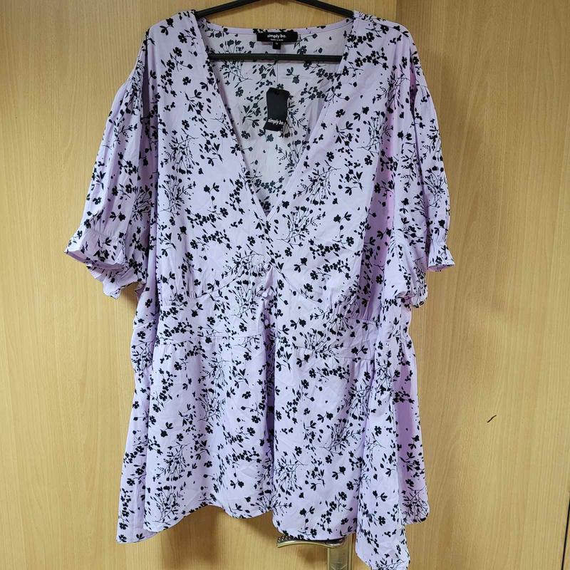 Блуза стрейч очень большого размера,под грудью кокетка, сзади талия на резинке,рукав фонарик внизу на резинке.Бледно сиреневого цвета.Ог 150+, талия 142+,Об 200+,рукав 27, длина 82.