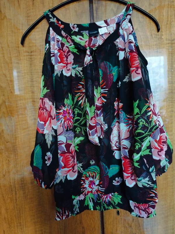 Яскрава шифоновая блузка. Плечи вiдкритi. Дуже красива, стильна. Эффекты и слыди носки виттсутни.