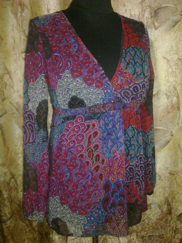 Классная, легкая туника, в оригинальные, разноцветные, восточные узоры, имеет фасон отрезной с под груди, на тонких, драпировочках- резиночках, к низу свободная, слегка, клешенная. Вырез мысом, на запах, рукава длинные, пышненькие, по низу на тонкой резиночке. По низу, на боку, есть лейбл названия фирмы. Изготовлена брендовой, немецкой фирмой EDC, из 100%вискозы, приятная, полу-прозрачная, как шифон, натуральная ткань. Маломерка, указано XL, но размер L- 50. Новая, навесных ярлыков нет, сток. РАЗМЕРЫ: ПОГ.=52см, ПОТ.резиночка=38см (тянется на 50см), ПОБ.=57см. Длн.издл.=72см, Длн.рукв.=65см, Шир.плеч=40см. ЛОТЫ КОМБИНИРУЮ!!!