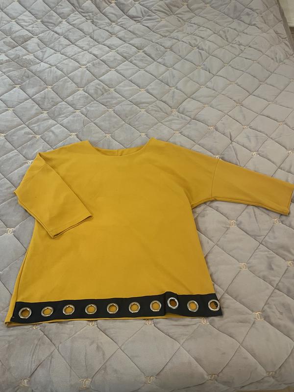 Кофтинка горчичного цвета в живую темнее как на фото,иде как оверсайс идеально будет на размер м,в низу с металлическими кольцами