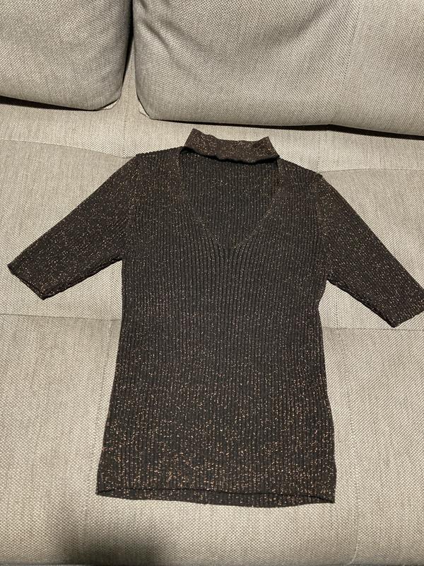 Кофта с золотым люрексом, в идеальном состоянии, одевалась 1 раз на празднования Нового года. Спереди V-образный вырез. Укороченный рукав.