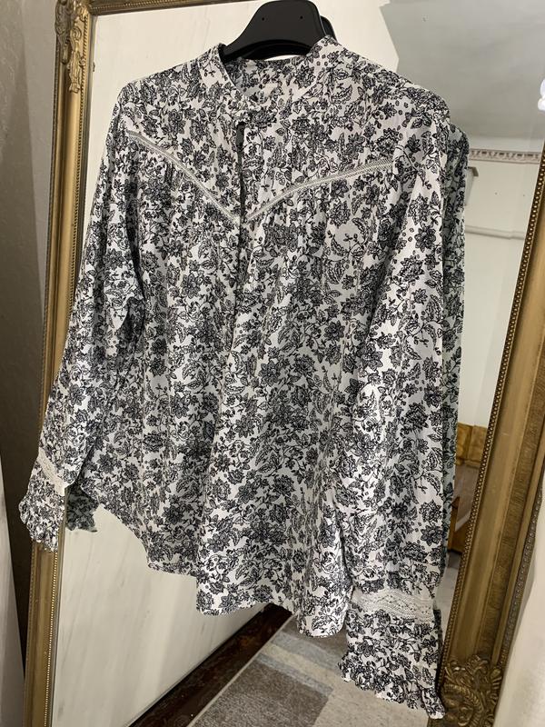 Блузочка в мелкие цветки в идеальном состоянии! Котон и вискоза! Размер 10, болеемерит, но она и должна быть свободной за счет ее кроя. По груди 68, бедра 75, плечи 43, рукав 62, длина 63 см