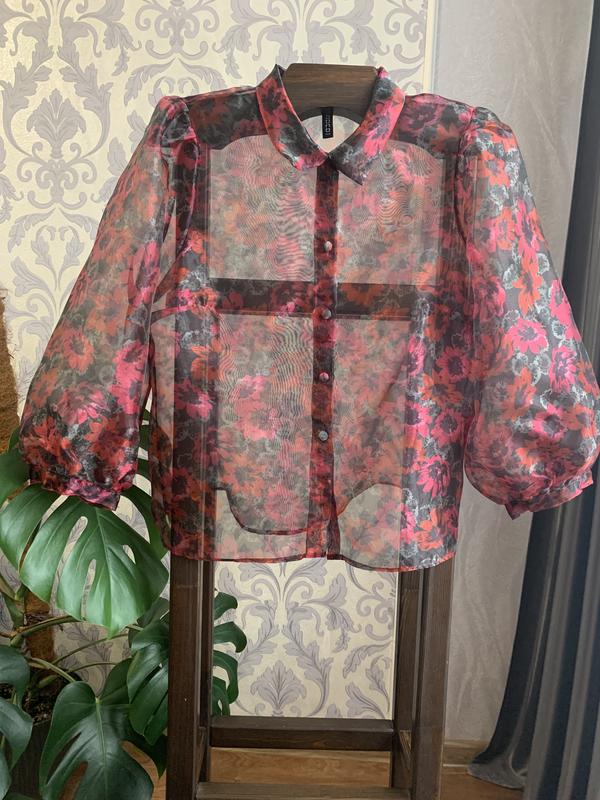 Прозрачная блуза в цветочный принт, застежка впереди на пуговицы. Рукава 3/4 длины объемной формы. Ткань имеет легкий блеск, в составе 100% полиэстер. Блуза будет красиво смотреться вторым слоем поверх маек, платье. Для смелых девушек поверх красивого белья. Состояние новой вещи. Замеры: ширина в груди 110см, ширина плеч 35см, длина рукава 49см, длина блузы 58см.