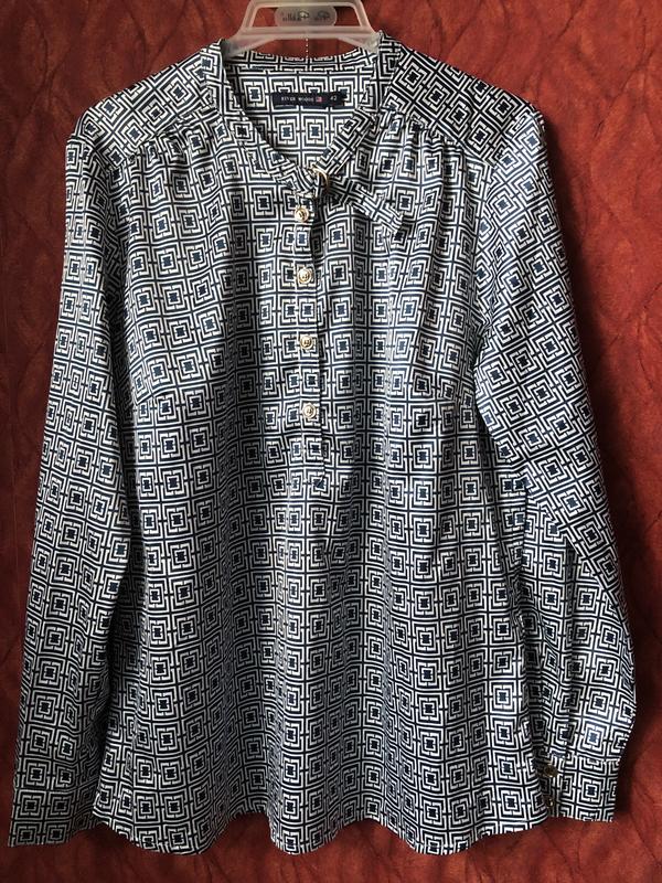 Чудова блуза з синьо-білим принтом. Стан нової речі. Повномірна L, вдалий крій з виточками по лінії грудей. Заміри за запитом. Можливе фото на моделі.