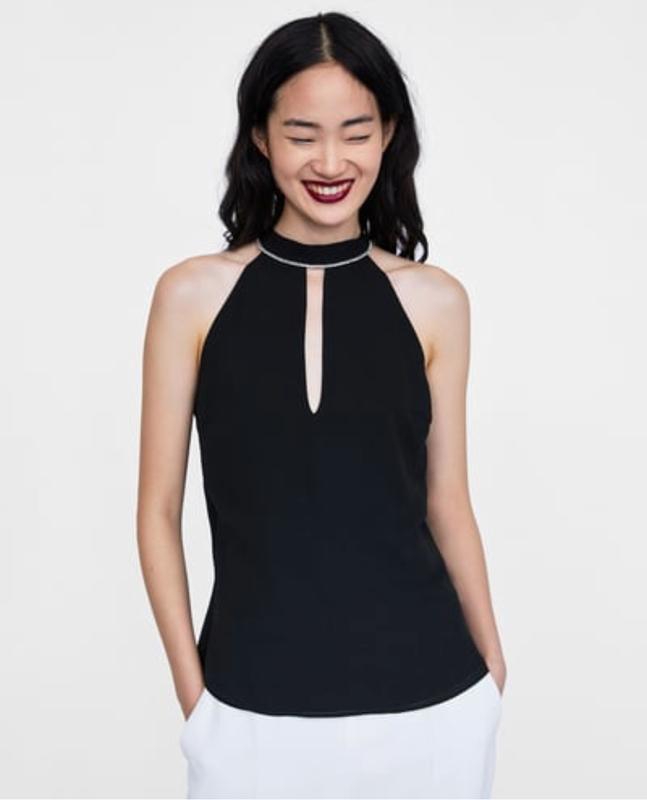 Топ вільного крою. Стійка. Аплікації з біжутерії біля шиї. Без рукавів. Відкриті плечі. Вільне декольте ззаду. Застібається на ґудзик біля шиї.