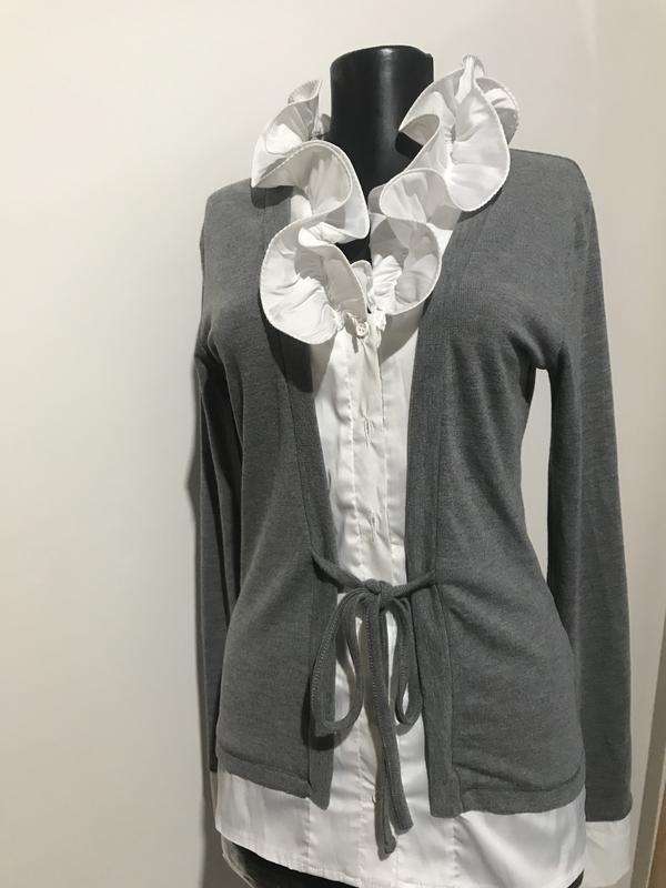 Кофта- блуза ,два в одном,з білими рюшами,натуральний матеріал ПОплечі 38 ПОгруді 43 ,тягнеться добре до 48 ПОталії 37 Довжина 63 Рукав від горл 73,від плеча 65 см Тягнеться гарно Турція