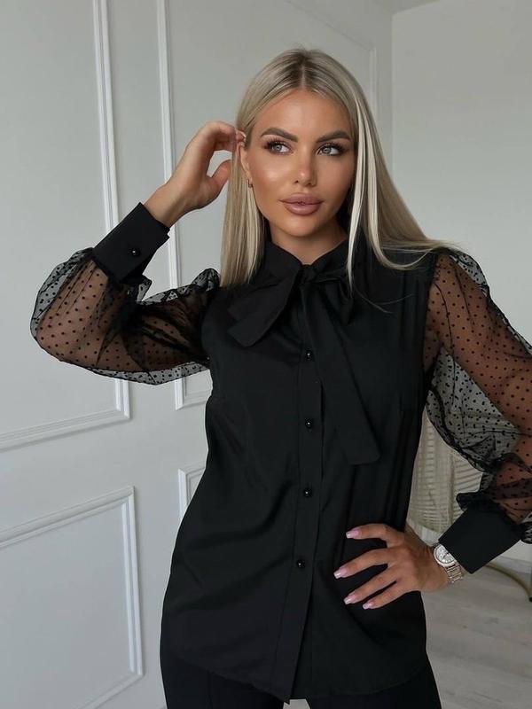 Блуза Фото пригляну! Мод. 1003 Ткань: Софт+Сетка горох Бант съемный. Гудзики рабочие (жемчуг).Комир-стойка Отличное качество! Размеры: 42-44, 46-48 Цена: 900грн