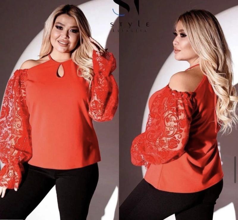 Кофточка Люрекс 675 Арт 0497Ц Материал: трикотажный креп. Вставки сетки с бархатистым рисунком. Не люрекс. Длина изделия 68см. Замеры: 💥48-52 : ОГ 96-107, ОБ 106- 112 💥54-58: ОГ 108-118, ОБ 118- 126 Размеры: 48-52, 54-58