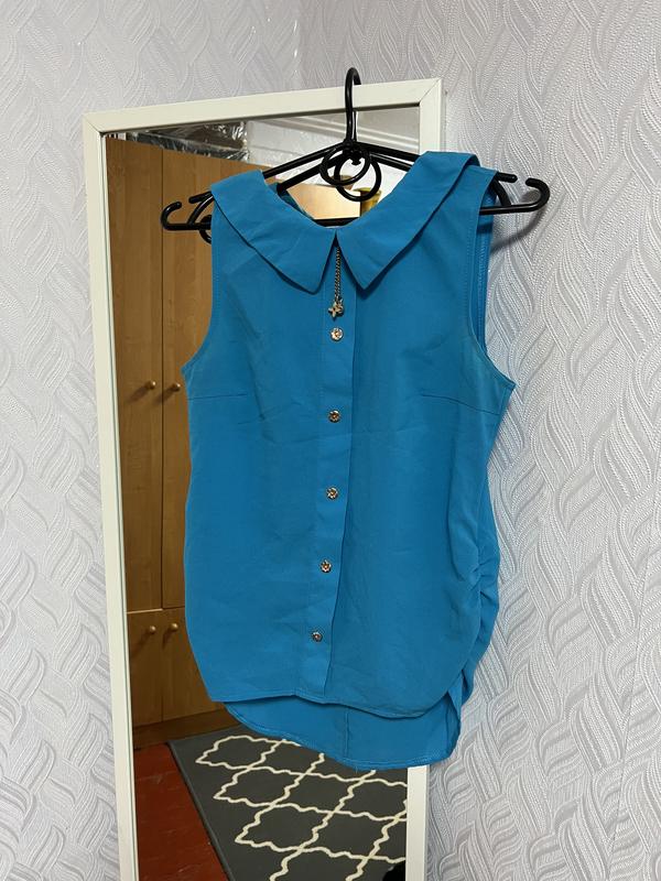 Блуза голубого насыщенного цвета, легкая, материал не просвечивает, сзади на скрытом замочке Размер S-M Длина от плеча 55-56см Грудь 42 см ( материал тянется )