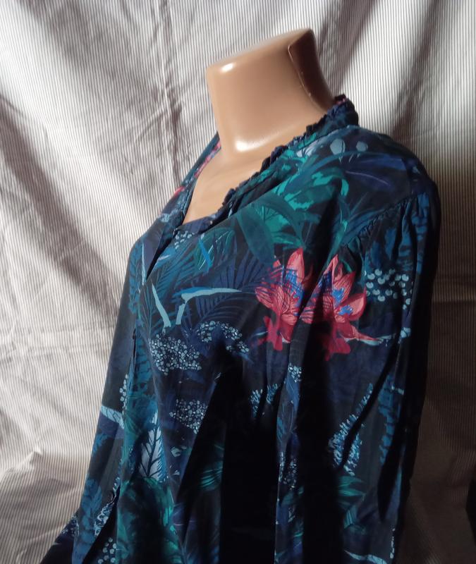Натуральна,з чудовим принтом.Комір оздоблений рюшем. ФОТО НА ТІЛІ НЕМАЄ. Довжина 67 Завширш(пахви) 57