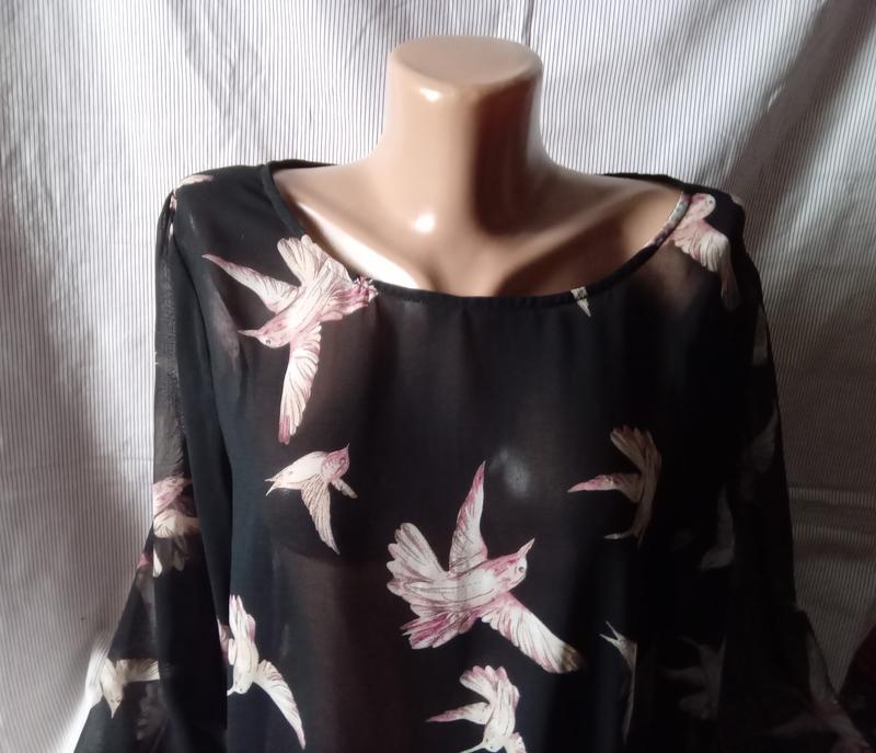 Ошатна,з асиметричною зав"язкою. Має чудовий пташиний принт. ФОТО НА ТІЛІ НЕМАЄ. Довжина 60 Завширш(пахви) 56 Річ нова,без паперової бірки -СТОК.