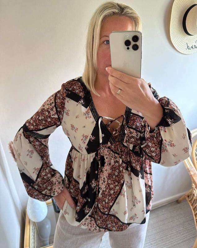 Оригинальная блузка из искусственного шелка в принт, имитирующий печворк. Интересный фасон: отрезная по линии груди (или под грудью), свободная к низу, спинка удлиненная, пышный рукав от локтя. Вырез на груди снабжен шнуровкой и отделан кружевом. пог 48- 51 пот 47 рукав 58 длина 65 на бирке 14