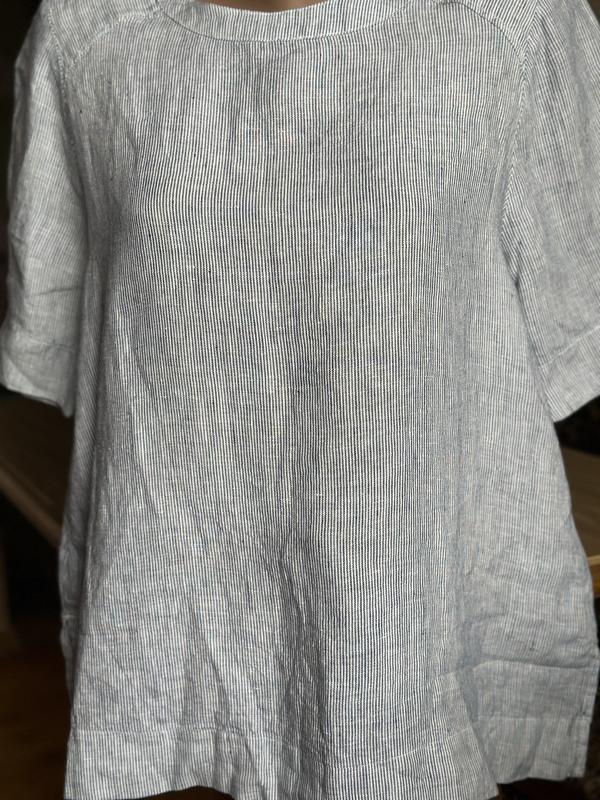 Базовая блузка хорошего качества приятна на ощупь легкая и комфортная, выглядывает стильно и эффектно состояние идеальный,без дефектов ткань 100% лен Замеры ПОГ 52 см Длина рукава 29 см Длина изделия 66 см