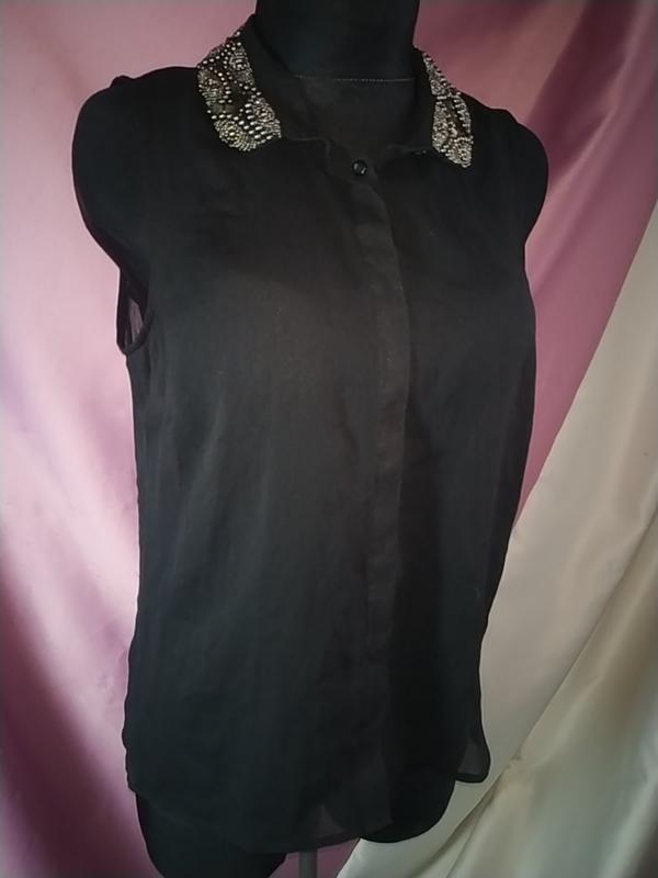 Черная полупрозрачная блузка без рукавов с украшенным бисером воротником