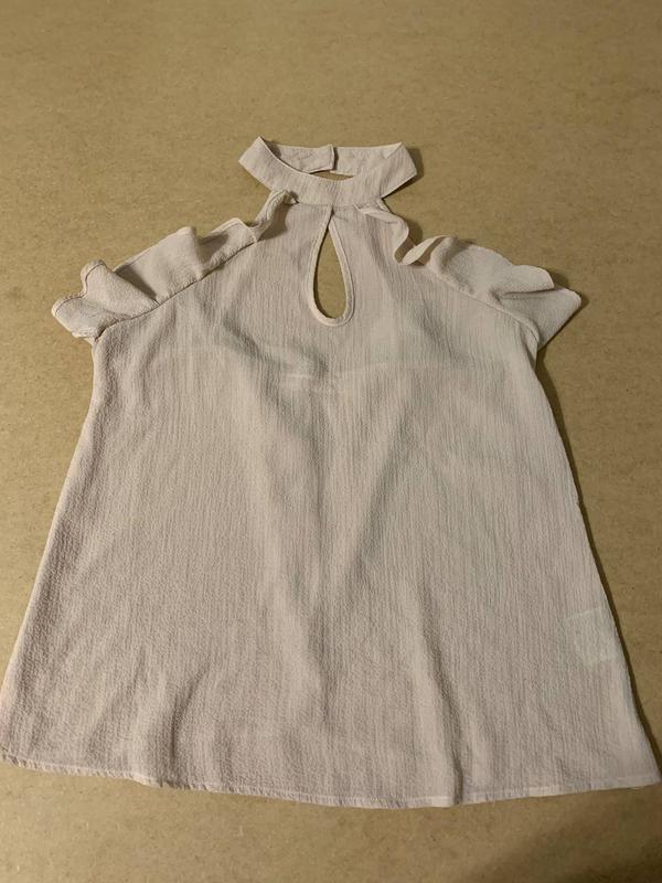 Бежевая полупрозрачная блуза с бретелями и застежками на шее. Длина по спине - 60см, полуобхват груди 42см.