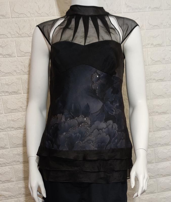 Красивая комбинированная шелковая блуза от Karen Millen Британия. Внутренняя часть сине - голубой шелк. Верх органза. Ворот стойка,сзади завязывается... Шелковая часть обшита мелкими золотыми паетками. Сбоку молния 30см. Замеры: Длина - 69см Пройма - 19см ПОГ - 44см + выточки. Под грудью 41см ПОТ - 42см Низ - 48см.