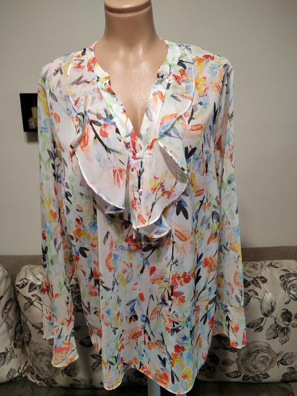 Очень красивая, полупрозрачная нежная блуза с воланами. ПОГ66, ширина по низу 71, длина от плеча 72, рукав 64, ширина рукава верх 22, ширина по спинке 46.