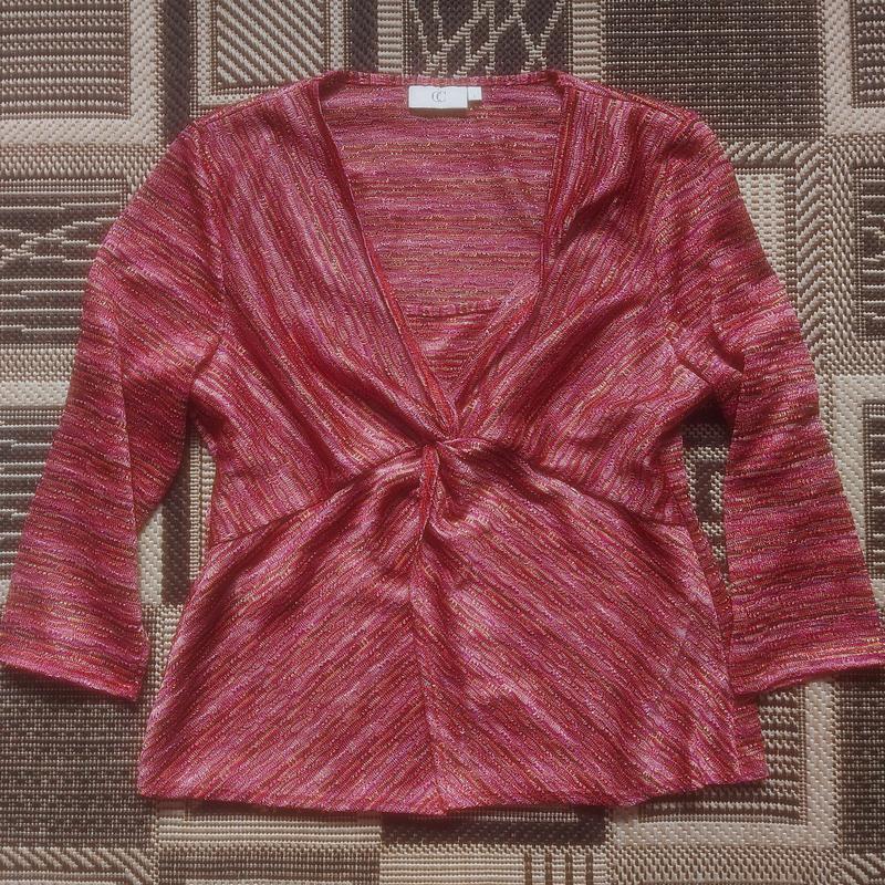 В чудовому стані, чуть тягнеться, трохи просвічує, як мікров'язка. Спереду подвійна( виглядає як майка під блузою). Плечі 38 Груди 45 Талія 43 Довжина 52 Рукав 45