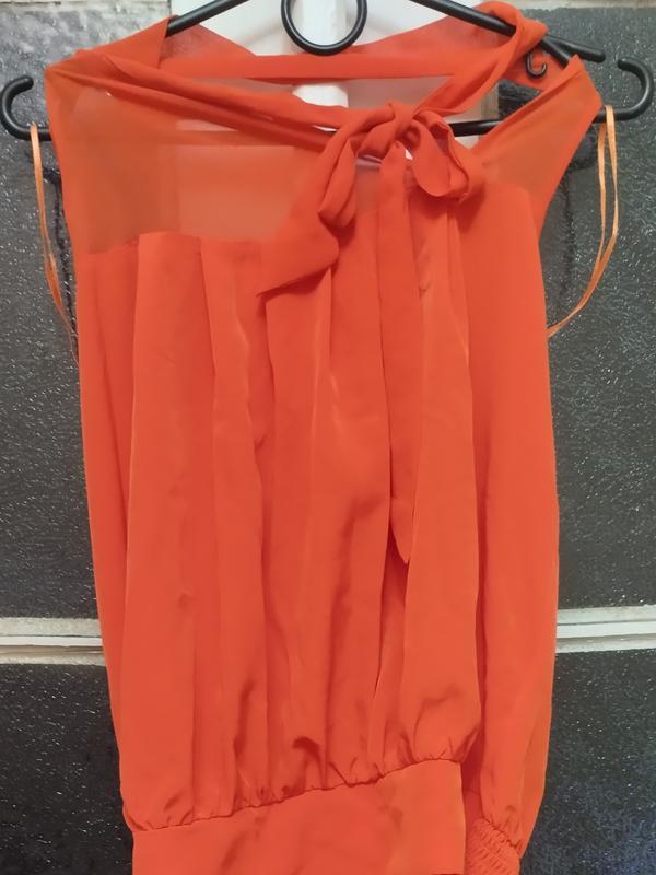 Блузка дуже красивого насиченого помаранчевого кольору, переливається тканина. Зверху одягається на шию, спереду зв'язується на бант на бік. На розмір М/46. Дуже оригінально викроєна. Заміри: Обхват грудей - 86 см, тягнеться до 100 см, позаду резинка. Обхват талії - 80 см, тягнеться до 106 см, позаду широка резинка. Довжина - 58 см. Стан ідеальний.