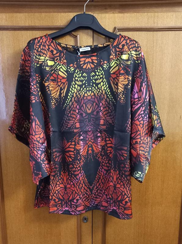 Свободного кроя шифоновая блузка Рисунок бабочки Широкие рукава Спинка из черного гипюра Длина 67 см Ширина низ 55 см