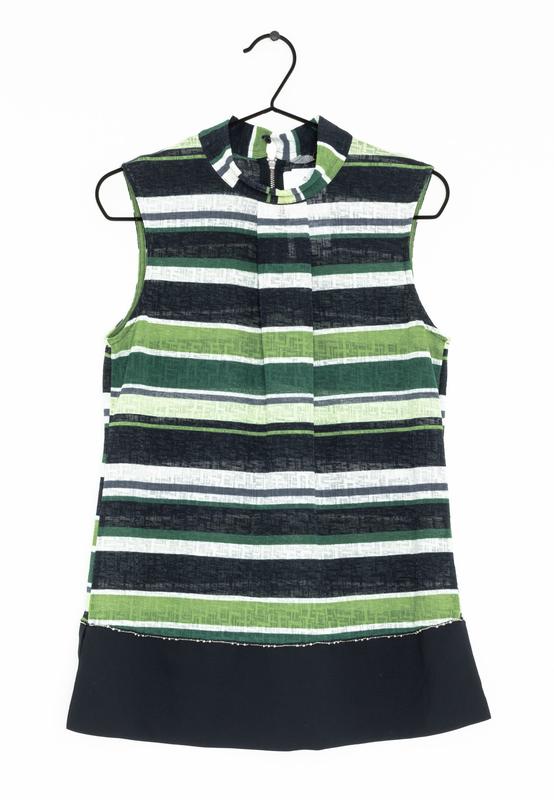 Летняя красивая блуза топ в полоску с высоким воротом На ощупь как льняная Застежка-молния и одна пуговица на шее Состояние идеальное Замеры: Плечи 34 Из подмышки до подмышки 46 Длина 66