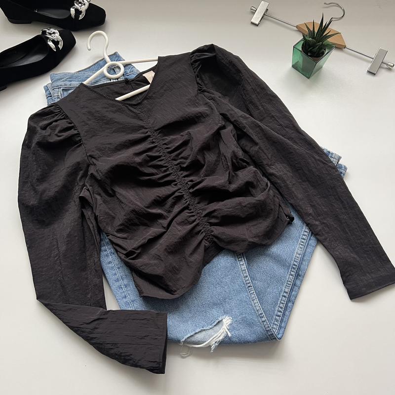 Н&М Интересная укороченная блуза - типа корсетка -жатка Сбоку скрытая молния Цвет: темный шоколад 100% полиамид ✅ 36eu На грудь до 90см будет Длина 48 НОГ 41 Рукав 62 Плечи 33 💰 160 грн
