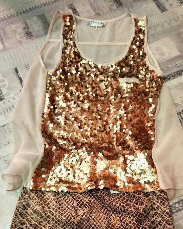 Жіноча легенька блузка з паєтками Розмір S ОГ 90 + - Вільна до низу йде на розширення Довжина : спереду 57 ззаду 75