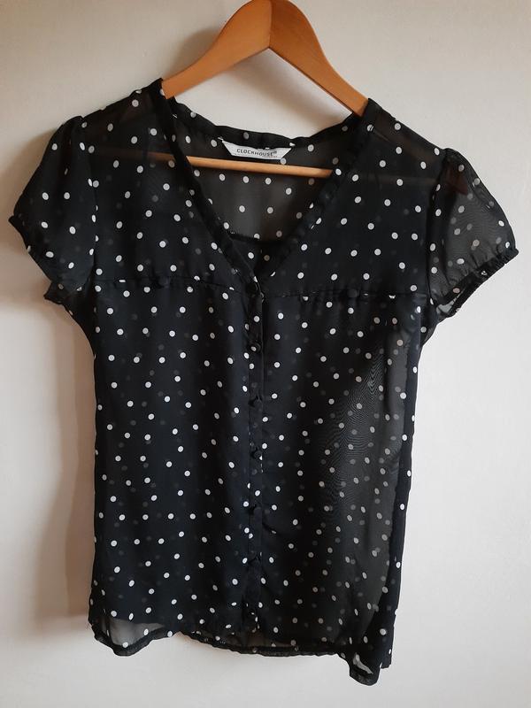 Блузка чорна в білий дрібний горошок з коротким рукавчиком. Блузка на застібку. Гудзики покриті тканиною. Край рукавчика на гумці. М'який штучний шовк. Стильна, молодіжна. дефекти відсутні. Просьба орєнтуватись на заміри. Півобхват Плечі 38см Півобхват Грудей 44см Півобхват Талії 44см Довжина 63см
