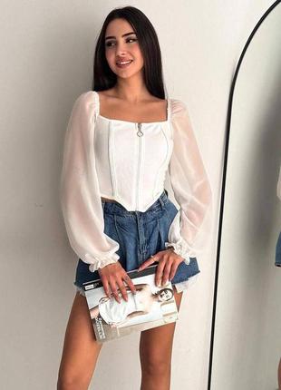 🔹️Модель: 1/93/0017 🔹️Ткань: креп-дайвинг + шифон 🔹️Размеры: 42-44, 46-48 🔹️Цвета: белый, черный Замеры: 42-44 Объем груди: 80-90 см 46-48 Объем груди: 88-98 см Длина по переду изделия : 34 см Длина рукава: 62 см